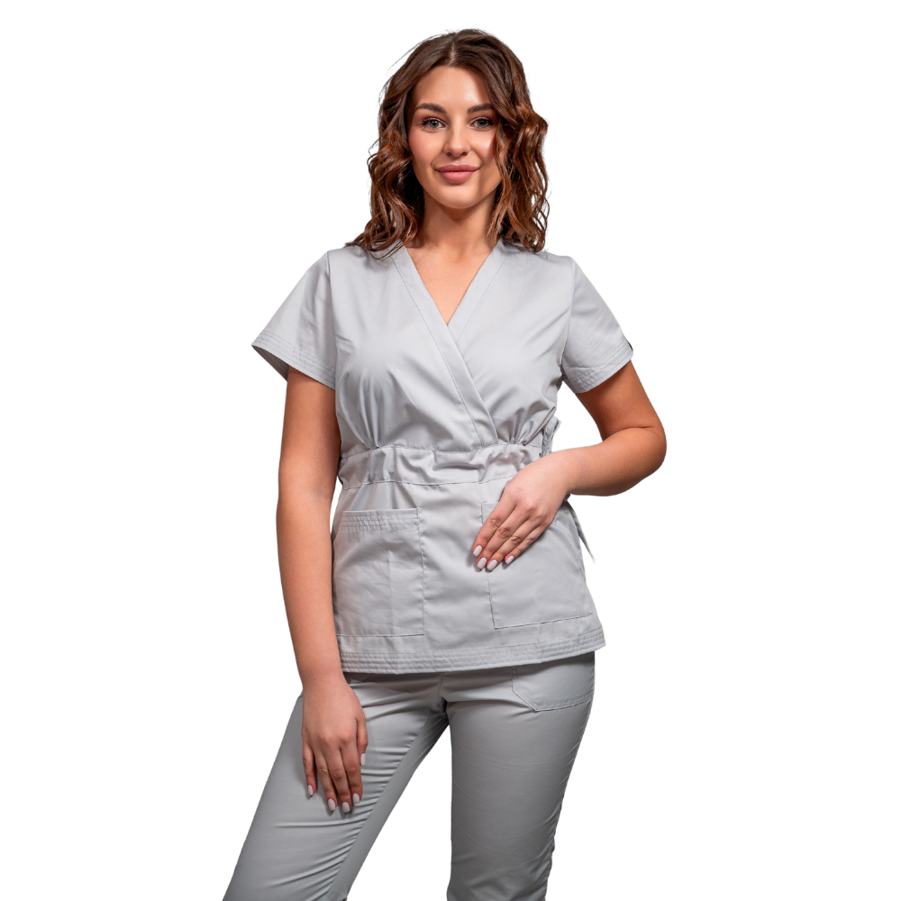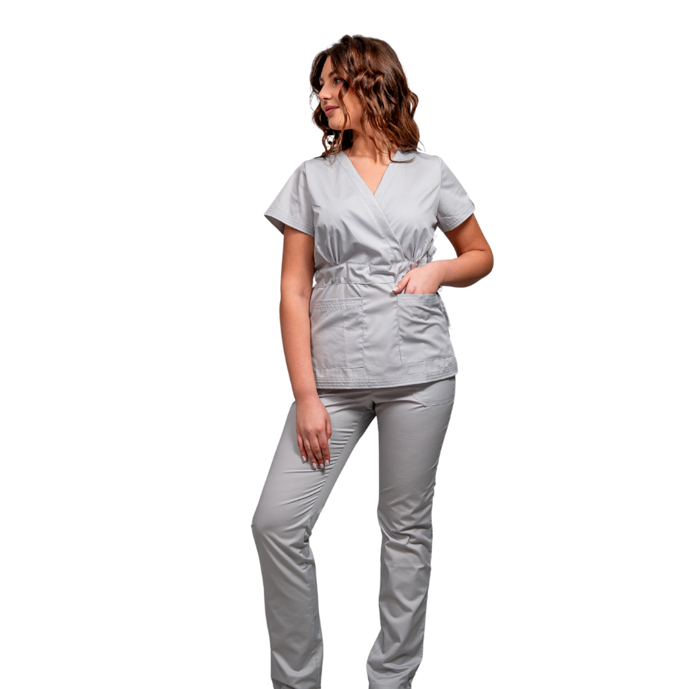 Женский костюм хирургический. Лиф топа с имитацией запаха. По талии топа размещена кулиска-пояс, в которую вставлен шнур, с помощью которого регулируется приталенность топа по талии. Рукав, накладные карманы и низ изделия декорированы четырехстрочной отсрочкой. С внутренней стороны обшивка на спинке декорирована высококачественной принтованной тканью. Рукав короткий. В боковых швах топа расположены разрезы. Брюки прямого покроя с двумя накладными карманами. Пояс цельнокроенный регулируется резинкой и тесьмой.