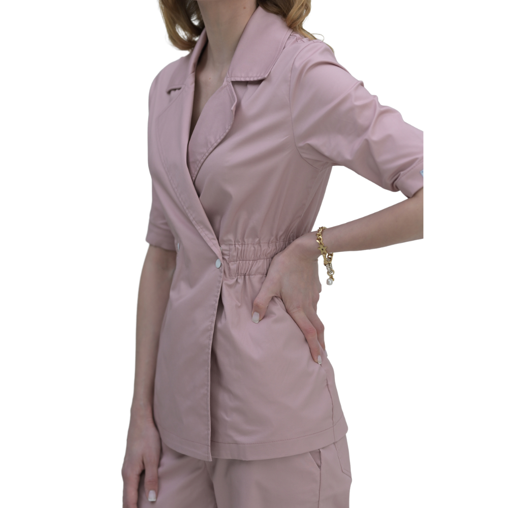Bluza damska o półdopasowanym kroju, dwurzędowa. Taliowana dzięki szerokiemu ściągaczowi-gumce. Rękaw wszywany, dwuszwy, zakończony mankietem zapinanym na napę. Na przodzie zapięcie na dwa rzędy nap. Dekolt w kształcie litery V. Kołnierz typu marynarkowego. Tkanina: holenderska bawełna medyczna premium (Holandia). Skład: 64% poliester, 34% bawełna, 2% elastan. Gramatura: 185 g/m². Okucia / dodatki: Niemcy.